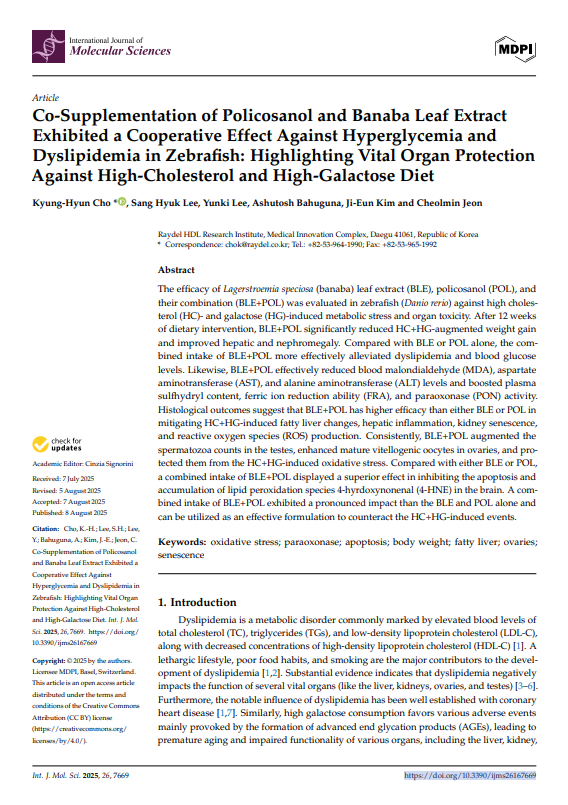CML로 유도된 당뇨 및 고지혈증 제브라피쉬에서 고혈당 및 이상지질혈증 개선을 위한 폴리코사놀(Raydel®)과 바나바잎 추출물의 상승 효능: 간과 신장 보호 및 조직 재생 촉진 효과