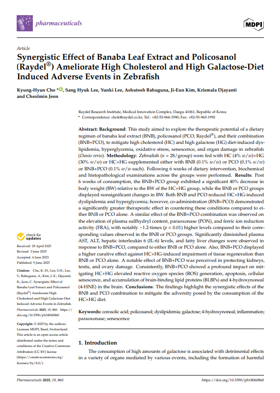 바나바잎 추출물과 폴리코사놀(Raydel®)의 상승 효과가 고콜레스테롤 및 고갈락토스 식이로 유도된 제브라피시의 이상 반응을 개선