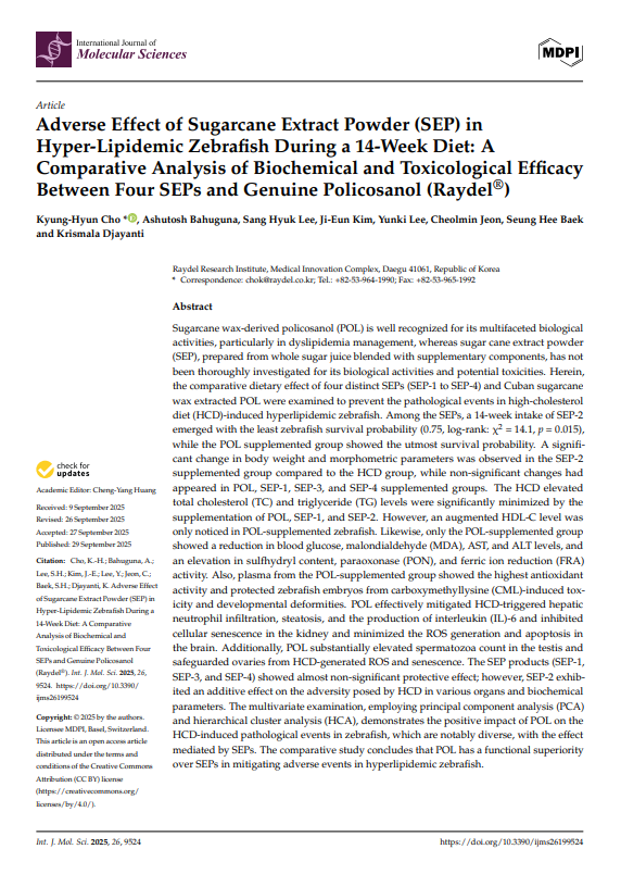 고지혈증 제브라피쉬에서 14주 식이 동안 사탕수수 추출 분말(SEP)의 부정적 효과: 4종 SEP와 순수 폴리코사놀(Raydel®)의 생화학적 및 독성 효능 비교 분석