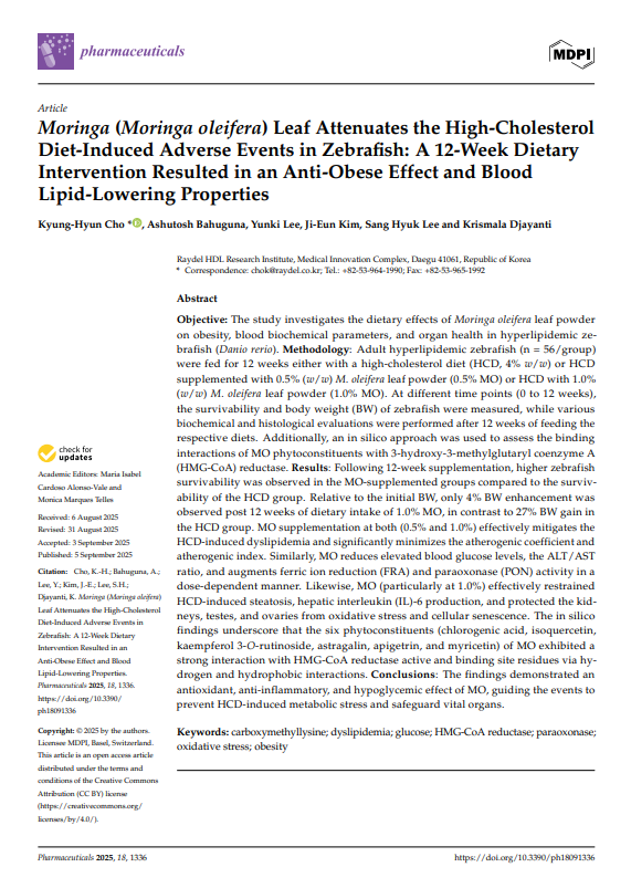 모링가(Moringa oleifera) 잎이 제브라피쉬에서 고콜레스테롤 식이로 유도된 이상 반응 완화: 12주 식이 개입으로 항비만 효과와 혈중 지질 저하 효과