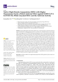 高いパラオキソナーゼを含む自然のHDLはCOVID-19に対して強い抗ウイルス効果がある反面、糖化されたHDLは抗ウイルス活性を損失